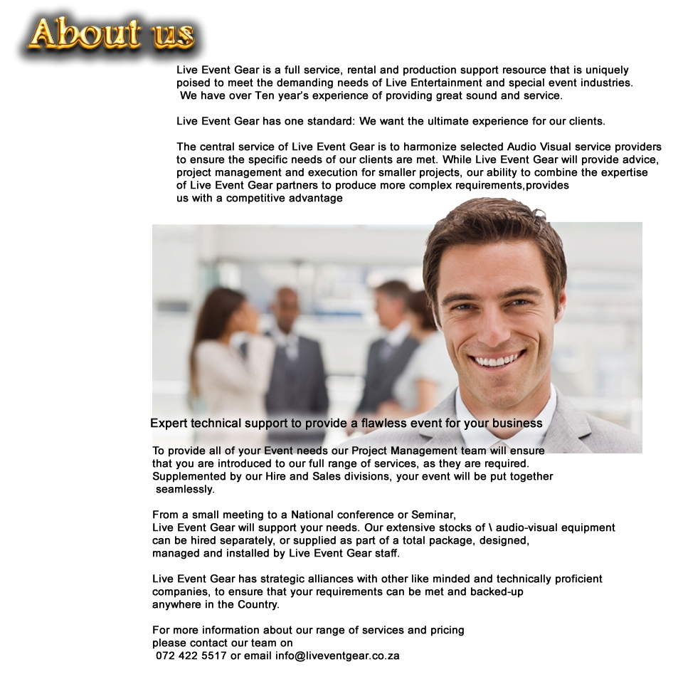 The central service of Live Event Gear is to harmonize selected Audio Visual service providers to ensure the specific needs of our clients are met. While Live Event Gear will provide advice, project management and execution for smaller projects, our ability to combine the expertise of Live Event Gear partners to produce more complex requirements, provides us with a competitive advantage